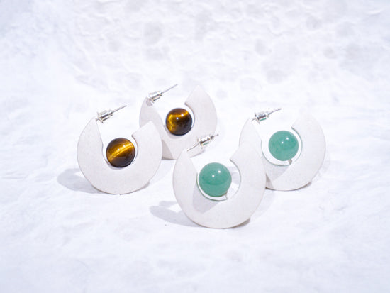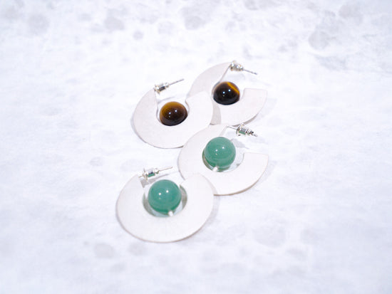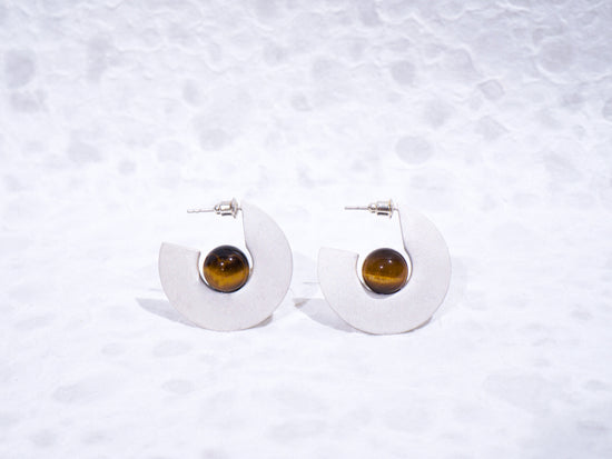 Crafted from 925 fine silver, this earring features a whitened base created through a traditional silver whitening technique and is set with a Tiger’s Eye stone and jade, while the upper band is expertly polished to a smooth, lustrous finish.