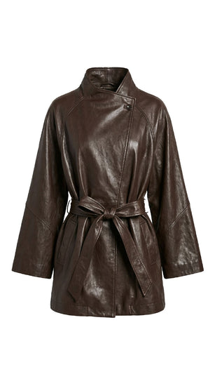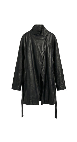 Designed with a high stand collar, wide sleeves, and an adjustable waist belt that can be worn fitted or loose.