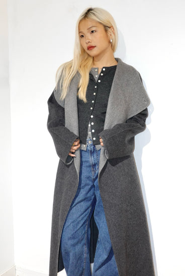 Features an asymmetric collar, a detachable waist belt, and a straight, elegant drape.
